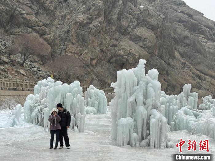 游客在賀蘭山巖畫(huà)景區(qū)內(nèi)的冰瀑布景觀群打卡拍照。 中新網(wǎng)記者 李佩珊 攝