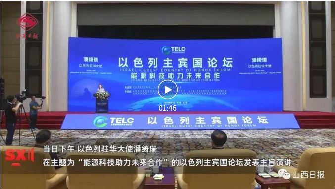 在高峰論壇發(fā)表主旨演講;與太原市市長(zhǎng)共同種植友誼樹(shù)30棵并樹(shù)立紀(jì)念碑,寓意中以30年合作取得豐碩成果;出席以色列分論壇與能源產(chǎn)業(yè)B2B對(duì)接會(huì)......作為以色列駐華大使,潘綺瑞和她所代表的以色列“主賓國(guó)”之旅很是繁忙。