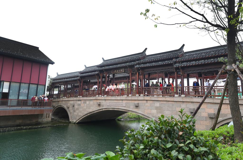 身著古裝的居民們在蟠龍?zhí)斓貎?nèi)的煙雨廊橋上表演。新華社記者方喆攝