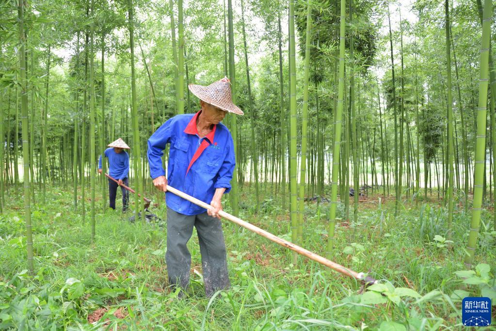 農(nóng)戶在福建省建甌市井岐村一處雷竹林里鋤草(6月8日攝)。新華社記者 張華迎 攝