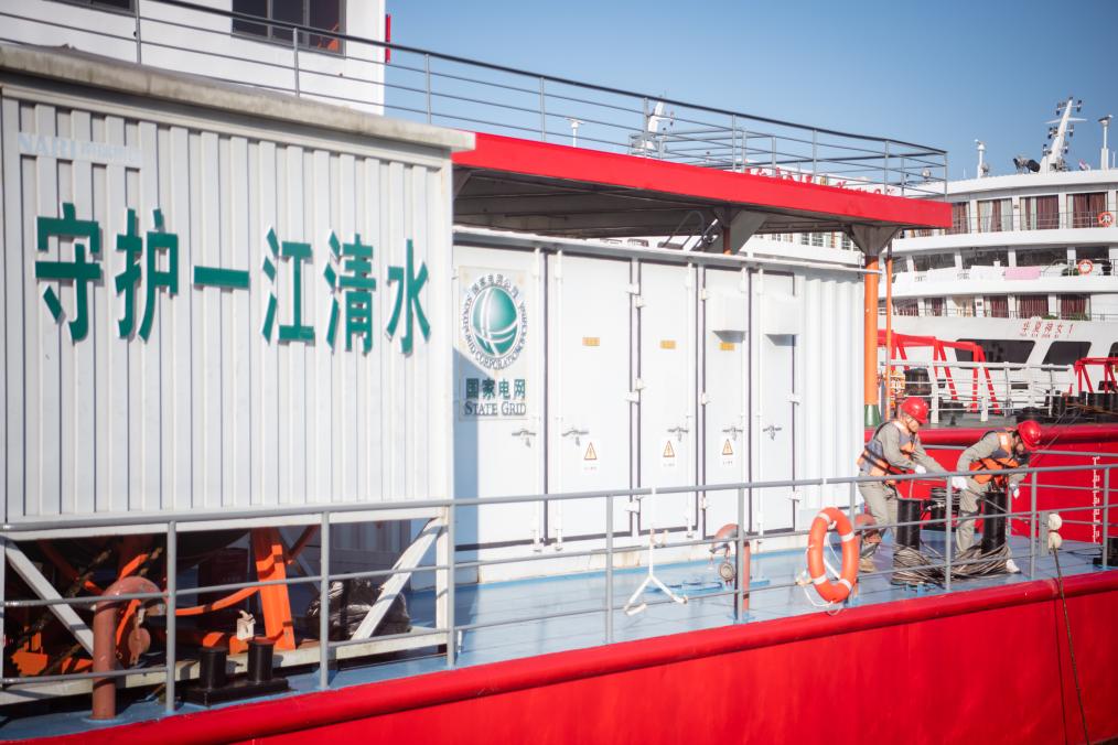 8月4日,國家電網(wǎng)宜昌供電公司岸電運(yùn)維人員在秭歸港供電躉船查看岸電系統(tǒng)專用接地線運(yùn)行狀態(tài)。新華社記者伍志尊 攝