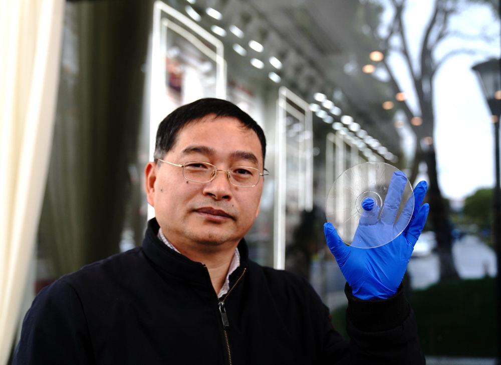 △2024年2月21日,上海光機(jī)所阮昊研究員展示“超級(jí)光盤(pán)”。