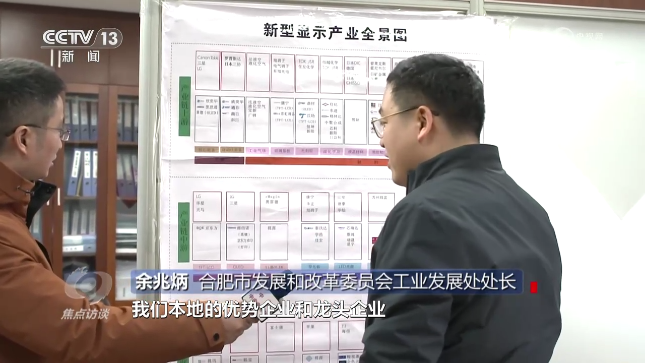 合肥市發(fā)展和改革委員會(huì)工業(yè)發(fā)展處處長(zhǎng)余兆炳:“新型顯示產(chǎn)業(yè)全景圖上面顯示了合肥市發(fā)展新型顯示的產(chǎn)業(yè)鏈的上游、中游、下游本地的優(yōu)勢(shì)企業(yè)和龍頭企業(yè),有這個(gè)全景圖,我們對(duì)標(biāo)作戰(zhàn)、掛圖作戰(zhàn)非??梢暬鲬?zhàn)?!?/p>