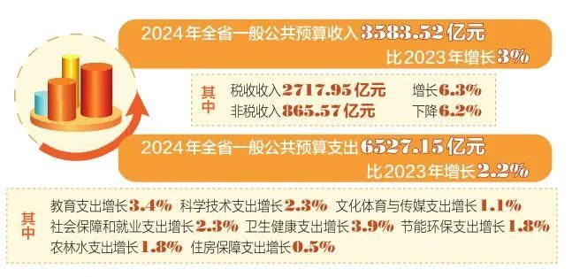 收支管理是財(cái)政工作的核心。按照政府預(yù)算報(bào)告,2024年全省一般公共預(yù)算收入3583.52億元,比2023年增長3%。其中,稅收收入2717.95億元,增長6.3%;非稅收入865.57億元,下降6.2%。全省一般公共預(yù)算支出6527.15億元,比2023年增長2.2%。其中,教育支出增長3.4%,科學(xué)技術(shù)支出增長2.3%,文化體育與傳媒支出增長1.1%,社會保障和就業(yè)支出增長2.3%,衛(wèi)生健康支出增長3.9%,節(jié)能環(huán)保支出增長1.8%,農(nóng)林水支出增長1.8%,住房保障支出增長0.5%。