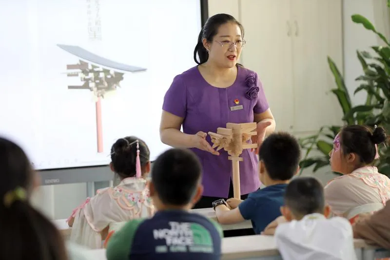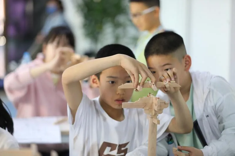在古建小課堂斗拱搭建中,省博物院老師選取中國古代建筑最關(guān)鍵也是最有特色的斗拱為原型,指導(dǎo)同學們制作了五臺山佛光寺唐代斗拱模型。不僅可以了解山西古代輝煌燦爛的建筑文化,還可以親自動手,體驗唐代斗拱的搭建,感受古代木作匠師的智慧,增進對中國古代建筑文化的了解。