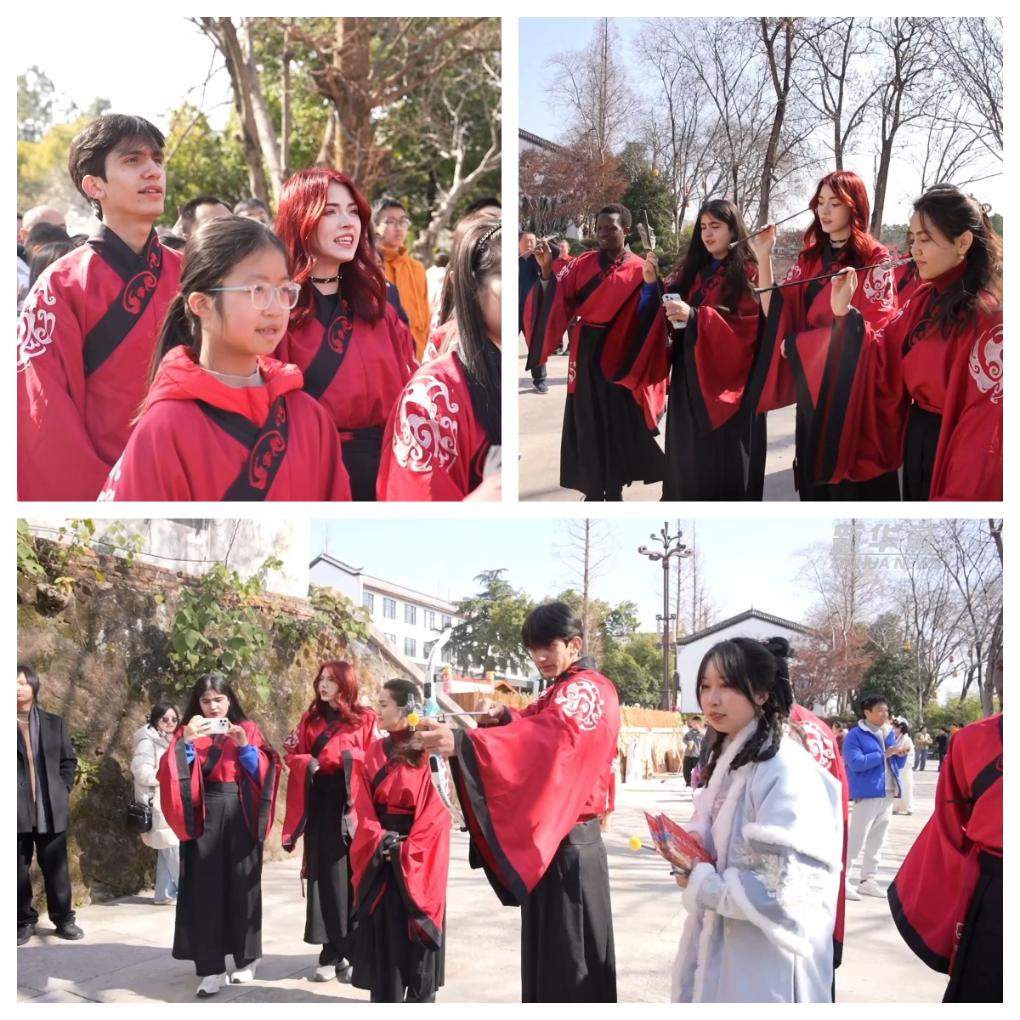 春節(jié)期間,來自浙江師范大學(xué)的10多位留學(xué)生在浙江金華參加了“我在中國過春節(jié)”的體驗(yàn)項(xiàng)目。他們身著漢服,到金華府文廟,向孔子像行拜師禮,并在新年祈福牌上書寫新年愿景。