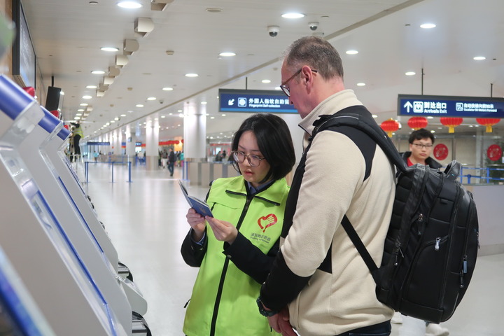 上海機(jī)場邊檢“百人外語志愿服務(wù)隊(duì)”民警正在協(xié)助外國旅客辦理入境手續(xù)。新華社記者唐斯琦 攝