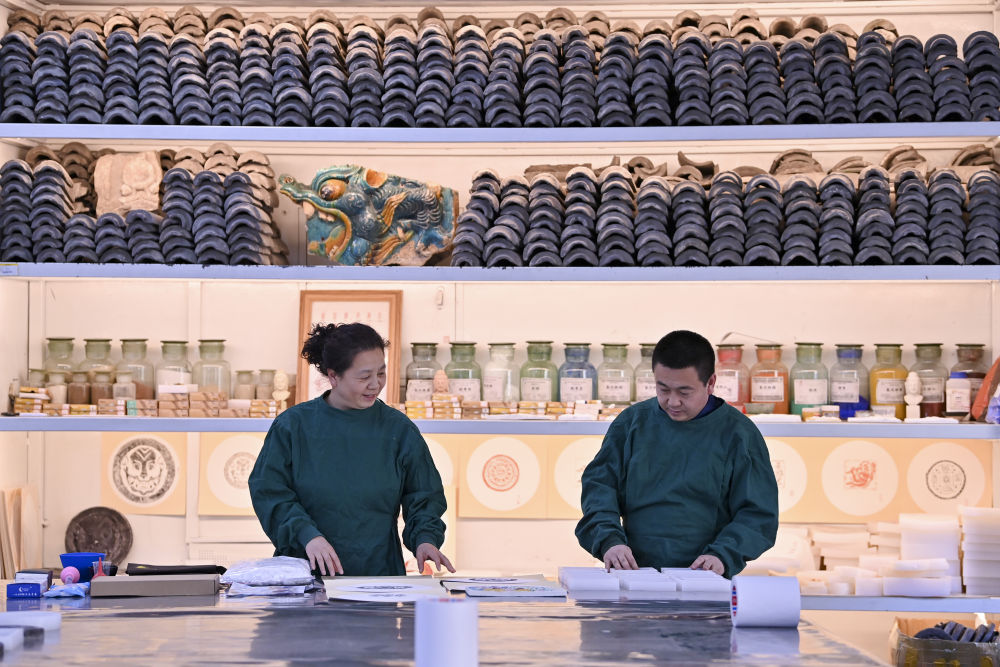 4月15日,在云岡研究院可移動(dòng)文物修復(fù)室,工作人員安永芳(左)和魏松林為接下來的研學(xué)活動(dòng)準(zhǔn)備相關(guān)用品。