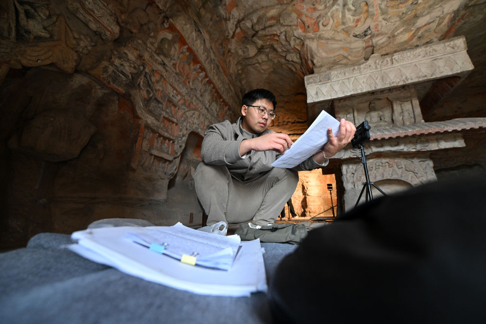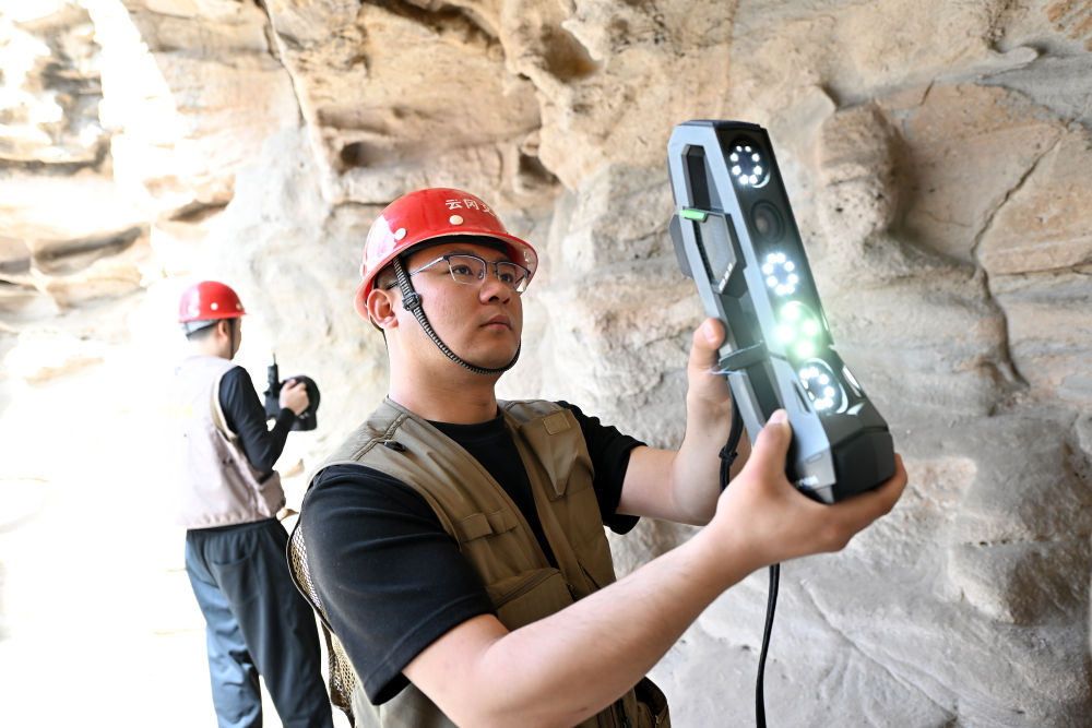 4月16日,在云岡石窟,云岡研究院數(shù)字化保護(hù)中心工作人員潘博(右)在進(jìn)行數(shù)字化信息采集。隨著“數(shù)字檔案”不斷完善