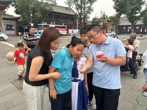 活動現(xiàn)場,在一個特殊的攤位上,由近到遠(yuǎn)分別擺放著“冰毒”“海洛因”“搖頭丸”等各種眼花繚亂的毒品仿真模型?!皝韥韥?,走過路過不要錯過!”“瞧一瞧,看一看!”禁毒社工在“攤位”前賣力吆喝著,一陣陣吆喝聲引來了眾多游客,游戲通過套圈的方式,組織游客套中現(xiàn)場的毒品模型并準(zhǔn)確說出毒品名稱即可獲得扇子、手機支架、帆布包等獎勵。