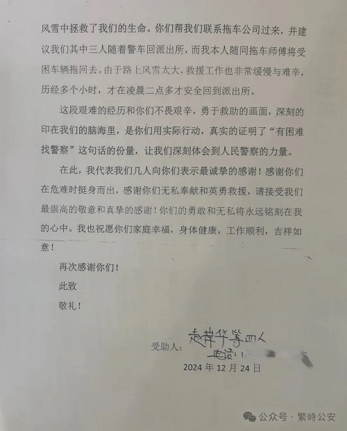 2025年1月1日,繁峙縣公安局收到了來自廣東省佛山市市民趙岸華等4人聯(lián)名寄來的感謝信,信中表達了對繁峙公安局神堂堡派出所民警頂風冒雪深夜馳援,及時救助其脫險的感激之情。