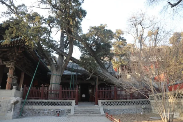 三千年晉祠的“見(jiàn)證者”——周柏。周柏長(zhǎng)于圣母殿右側(cè),18米長(zhǎng)的周柏向南傾斜生長(zhǎng),被另一株古柏所支撐,樹葉披覆在圣母殿頂,樹干粗壯,得幾人才能合抱,像一條橫臥的巨龍,因此有“臥龍柏”之美譽(yù)。經(jīng)科學(xué)測(cè)定,此樹已有二千九百九十多歲。在晉祠,樹齡在千年以上的蒼松、翠柏、古槐等尚存二十余株,它們和古柏一起見(jiàn)證著晉祠的悠悠歷史。