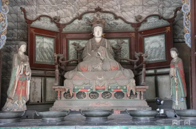 外觀玲瓏似涼亭——獻(xiàn)殿。獻(xiàn)殿是給圣母殿邑姜供奉祭品的享堂,始建于金大定八年(1168),明萬(wàn)歷二十二年(1594)重修。獻(xiàn)殿高9.75米,其梁架節(jié)省材料且堅(jiān)固,斗拱結(jié)構(gòu)疏朗,外觀玲瓏似涼亭。