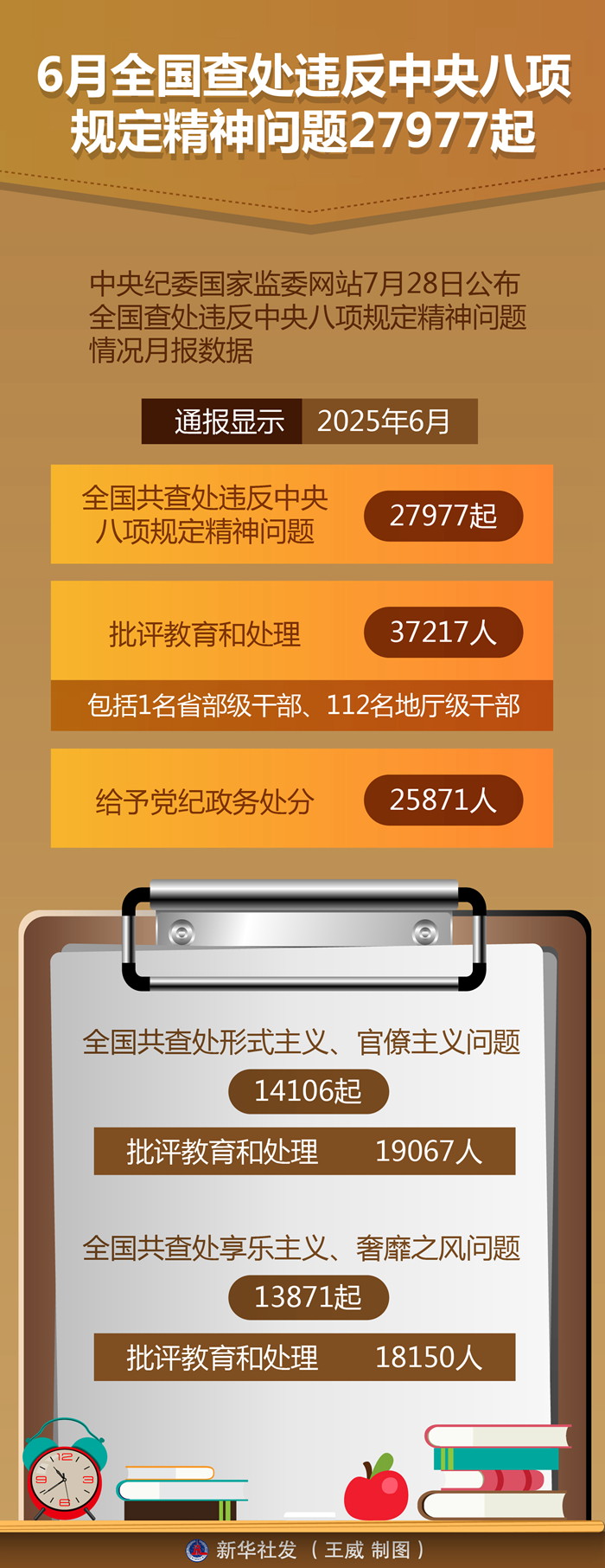 新華社北京7月28日電(記者孫少龍)中央紀委國家監(jiān)委網(wǎng)站28日公布全國查處違反中央八項規(guī)定精神問題情況月報數(shù)據(jù)。通報顯示,今年6月,全國共查處違反中央八項規(guī)定精神問題27977起,批評教育和處理37217人(包括1名省部級干部、112名地廳級干部),給予黨紀政務處分25871人。